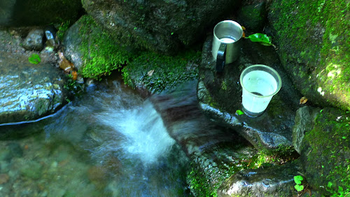 泉水下擺了兩個杯子,但我只敢用手心掬來喝。後面那位婦女後來也到了,她拿出水壺,倒光裡面的水,接了滿滿一罐。陸續有登山客過來接泉水,也都先把隨身帶的水倒光,甚至有人帶來了三罐空水罐,每罐都裝滿了離開。確實正確,這是最天然、最甘美的礦泉水,而且不用錢。