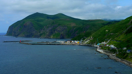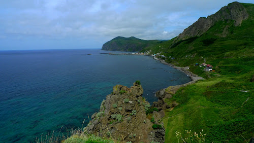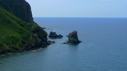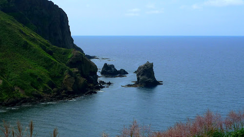 鏡頭拉到更遠,可以隱約看到地藏岩。那也是禮文地標之一,海岸線上有塊高聳直立的黑色尖石,可惜觀光團沒有帶去那裡。